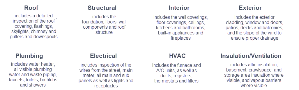 whether to proceed with the purchase of the home is prudent, or perhaps use the information from the inspection to negotiate the terms of your purchase. A general home inspection includes a visual examination of the following components: